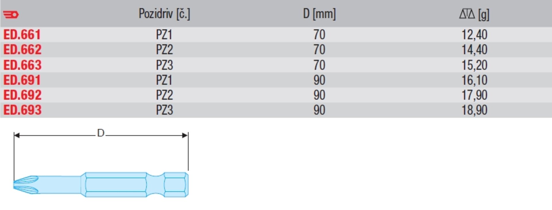 Produkty Vybavení autoservisů a dílen Ruční nářadí BIT 1/4 PZ 2 DÉLKA 70 MM ED.662