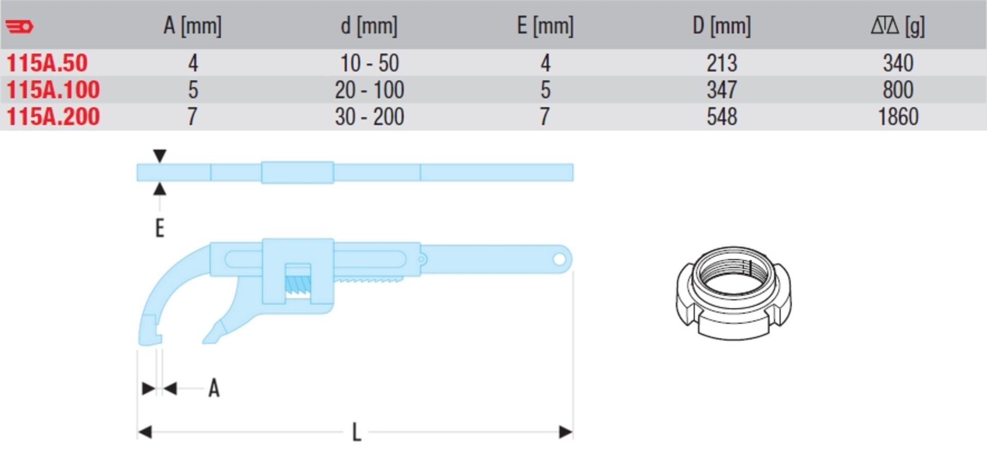 Produkty Vybavení autoservisů a dílen Ruční nářadí STAVITELNÝ HÁKOVÝ KLÍČ 50 MM 115A.50